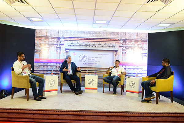 20-01-2024Audi 1 – Session 3 : 2.15 pm ‘Content 2.0 – Future of Digital Discourse’, the topic for the third session of the Mangaluru LIT Fest organized by Barath Foundation in collaboration with Mythic Society. The session was moderated by Mr Sharan Shetty. The panelists for session were podcasters Kushal Mehra, Abhijit Chavda, Vinamre Kasanaa.
