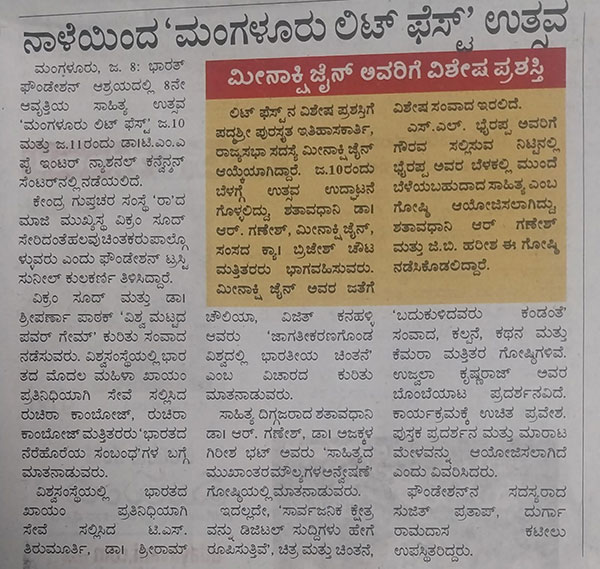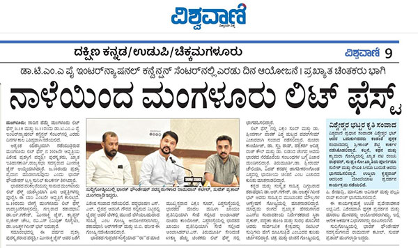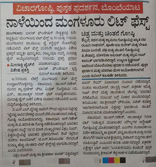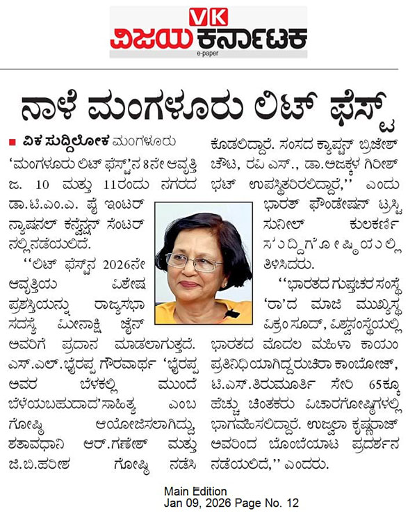 Media Reports 09-01-2026 Eighth edition of Mangaluru Lit Fest begins on January 10 ಜ.10- 11ರಂದು ಮಂಗಳೂರು ಲಿಟ್ ಫೆಸ್ಟ್ ; ರಾಜ್ಯಸಭೆ ಸದಸ್ಯೆ, ಇತಿಹಾಸಕಾರ್ತಿ ಮೀನಾಕ್ಷಿ ಜೈನ್ ಗೆ ಲಿಟ್ ಫೆಸ್ಟ್ ಪ್ರಶಸ್ತಿ, ‘ರಾ’ ಮಾಜಿ ಮುಖ್ಯಸ್ಥ ವಿಕ್ರಮ್ ಸೂದ್ ಸೇರಿ ಖ್ಯಾತ ಚಿಂತಕರು ಭಾಗಿ, ಎಸ್.ಎಲ್.ಭೈರಪ್ಪ ಗೌರವಾರ್ಥ ವಿಶೇಷ ಗೋಷ್ಠಿ Eighth edition of Mangaluru Lit fest to begin on January 10 Mangaluru Lit Fest Season 8 to host 65 prominent thinkers ಜ.10 ಮತ್ತು 11 ರಂದು ನಾಡಿನ ಹೆಮ್ಮೆಯ ಮಂಗಳೂರು ಲಿಟ್ ಫೆಸ್ಟ್ ಜ.10-11: ಮಂಗಳೂರು ಲಿಟ್ ಫೆಸ್ಟ್